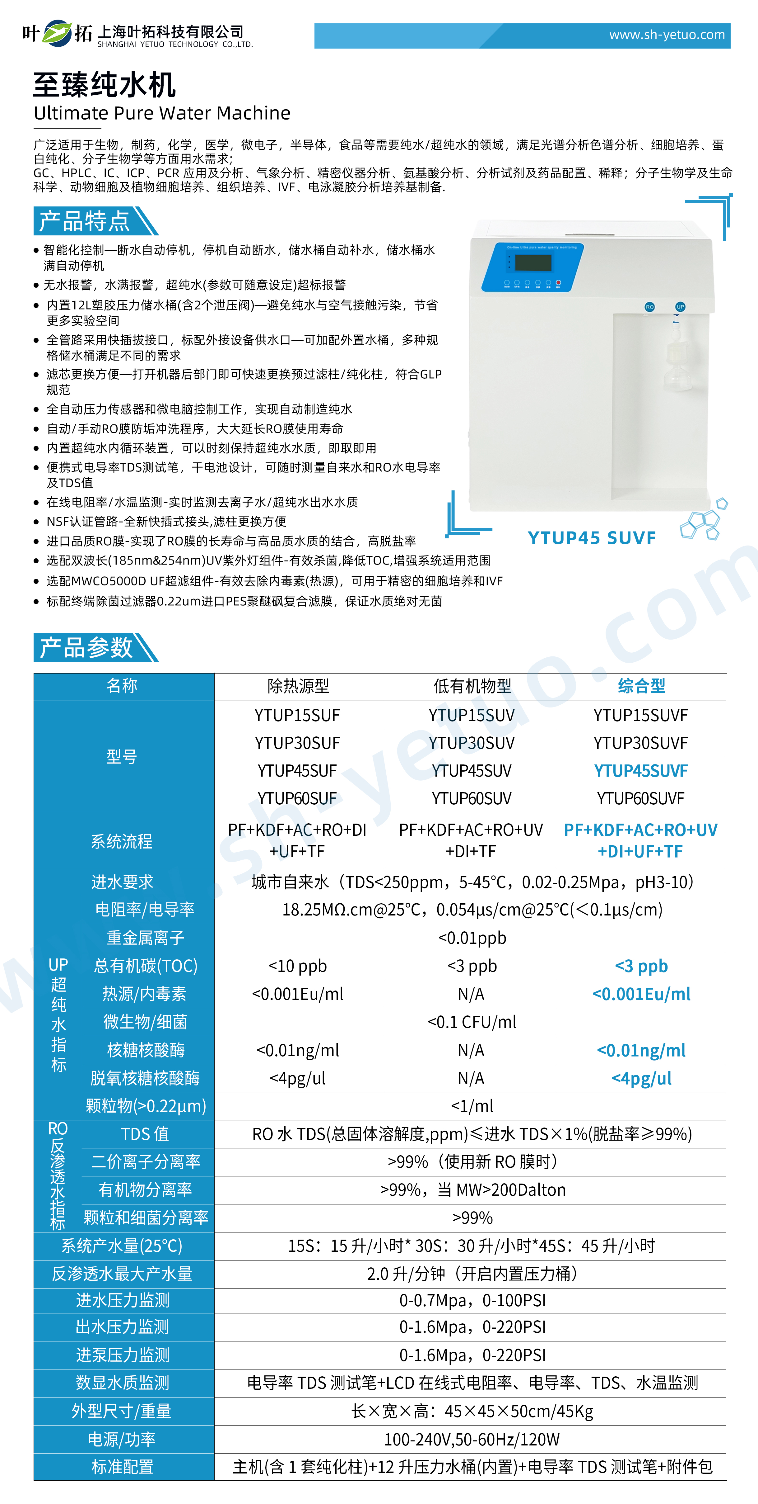 葉拓 YTUP45SUVF 超純水機(綜合型)詳細參數